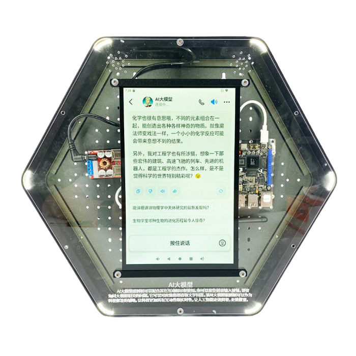 Интерактивный модуль для оформления зон рекреации, кабинетов, IT-полигона, библиотеки, медиа зоны. Модуль демонстрирует принцип работы системы распознавания действий человека на основе искусственного интеллекта. Модуль выполнен в форме шестиугольной призмы с интерактивным наполнением.