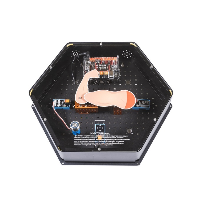 Модуль демонстрирует принцип работы cистемы распознавания действий человека на основе искусственного интеллекта. Выполнен в форме шестиугольной призмы с интерактивным наполнением.