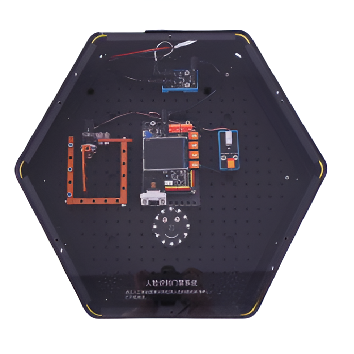 Интерактивный модуль для оформления зон рекреации, кабинетов, IT-полигона, библиотеки, медиа зоны. Модуль позволяет изучить применение компьютерного зрения, искусственного интеллекта и других информационных технологий, а также включает в себя проектирование аналоговых дверей и управление ими, что требует понимания принципов механики. Модуль выполнен в форме шестиугольной призмы с интерактивным наполнением.